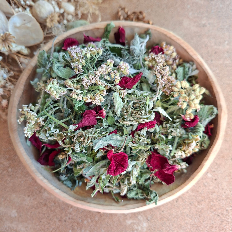 This blend is made with rose, motherwort, applemint, curlymint, wild mugwort, and yarrow – herbs long known to support womb health and cyclical balance. Rose soothes and opens, motherwort strengthens and steadies, the mints cool and refresh while also stimulating circulation, mugwort calls on the dreaming and clearing powers of the old ways, and yarrow protects, tones, and restores.